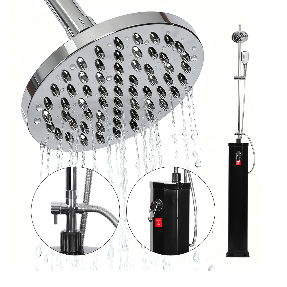 Denna LY18L09-B 18L soldusch i pvc vid poolen med mobil huvuddusch i rostfritt stål är designad för att ge komfort och avkoppling till en mängd olika utomhusmiljöer, oavsett om det är i trädgården, vid poolen eller på campingturer, och erbjuder en modern lösning för att njuta av varmt vatten utan behov av externa energikällor. Den har ett överdimensionerat regnduschhuvud med en inbyggd kulled som möjliggör enkel justering upp till 180°, vilket säkerställer flexibilitet vid användning och gör installationen enkel. Det flexibla duschhuvudet i regnskogsstil förbättrar upplevelsen genom att du enkelt kan kontrollera vattenflödet, vilket skapar en lugnande, spaliknande känsla som liknar att stå under ett naturligt vattenfall. Tillsammans ger dessa funktioner en uppfriskande och anpassningsbar duschupplevelse, vilket gör den idealisk för alla som söker både praktiska funktioner och avkoppling utomhus.