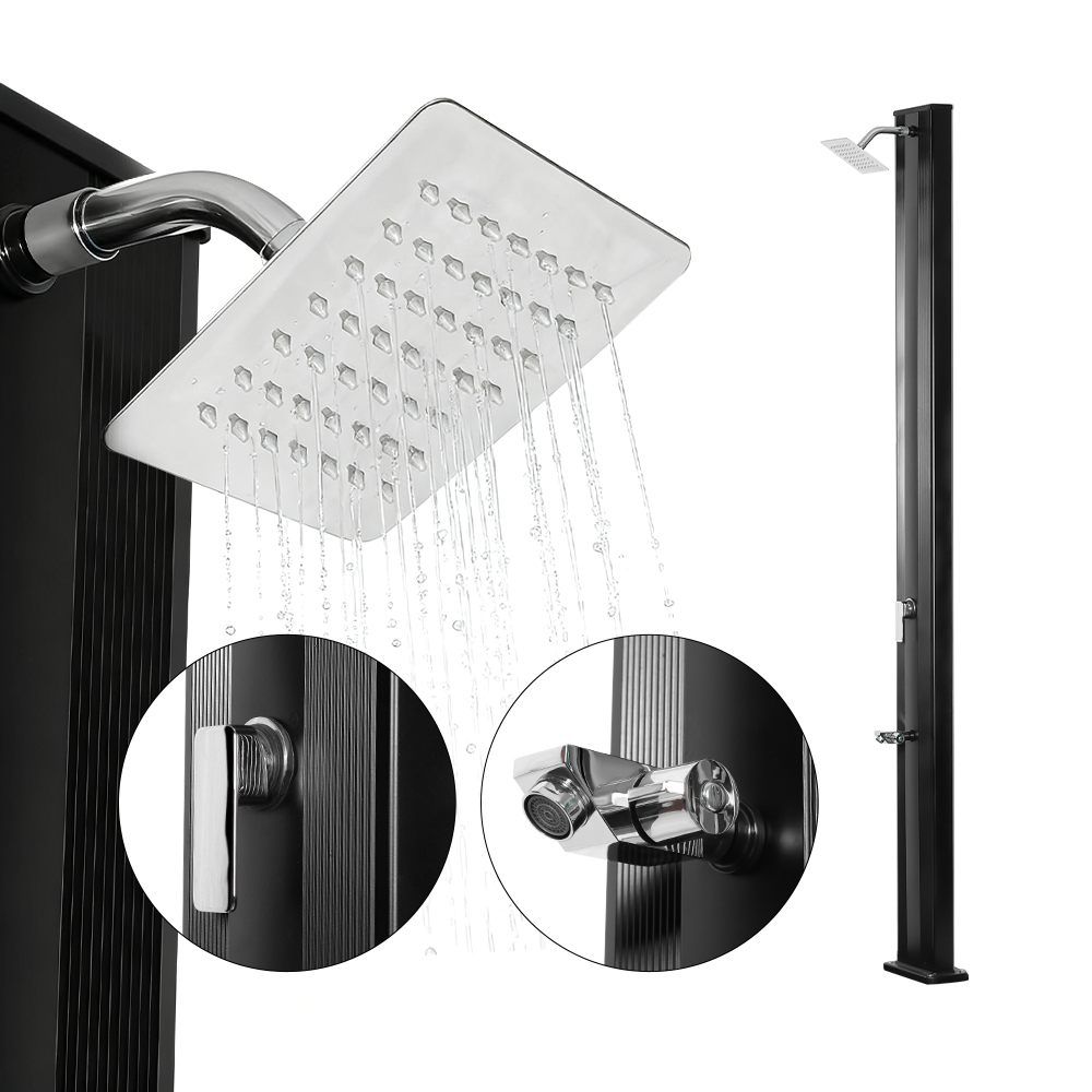 Detta LY30L02 regnduschhuvud för utomhusbruk engreppsdusch har ett 30-liters duschrör i aluminium, vilket ger gott om vatten för en bekväm, uppfriskande duschupplevelse, vilket gör den idealisk för användning i trädgården eller utomhus. Engreppsblandaren möjliggör snabb och enkel temperaturjustering, så att användaren kan justera vattentemperaturen till önskad inställning. Det stora regnduschhuvudet har en integrerad kulled som vrids 180°, vilket förstärker kyleffekten och förenklar installationen, för ökad bekvämlighet och komfort.