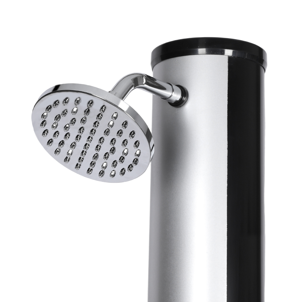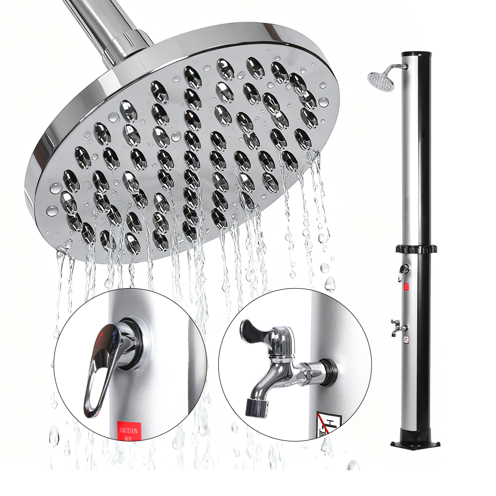 Denna LY35L02-CR justerbara och vattentäta soldusch kombinerar funktionalitet med komfort, med ett stort duschrör som värms upp till cirka 60°C med enbart solljus, vilket eliminerar behovet av elektricitet. Fäst helt enkelt en vanlig trädgårdsslang för att fylla duschröret, vilket gör det enkelt för hela familjen att njuta av en uppfriskande utomhusdusch i trädgården, vid poolen eller när du campar. En praktisk metallbricka håller badartiklar som tvål eller schampo inom bekvämt räckhåll, medan en genomtänkt avloppskanal i botten förhindrar att vatten samlas, vilket håller området rent och säkert. För att öka komforten möjliggör det justerbara duschhuvudet flexibel vattenstrålekontroll, så att du kan skräddarsy flödet efter dina personliga önskemål. Dess spray i regnskogsstil ger en lugnande duschupplevelse med naturlig känsla och förvandlar varje sköljning till en stunds avkoppling.