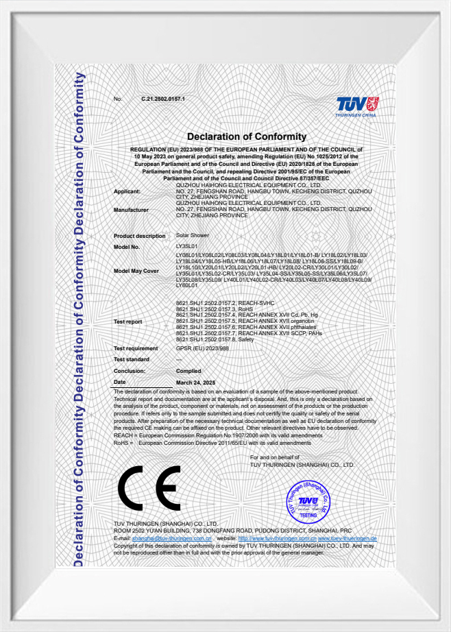 Verksamhet från en massiv produktionsbas, Quzhou Haihong Electrical Equipment Co.,Ltd. ämnen varje sats av Solar Dusch WPC Board till vridmomenttester och hög-låg temperatur cykling. Denna uppmärksamhet på detaljer gör att våra produkter sömlöst kan betjäna stora globala återförsäljare som Walmart och Bestway.